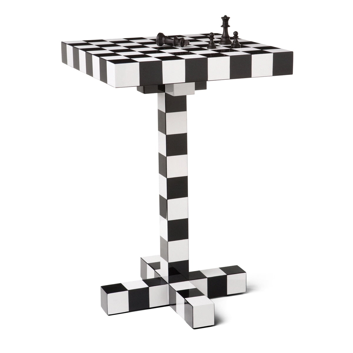 The chess pattern can be found not only on the desktop, but it extends across the entire table down to the feet. Even the bottom sides are covered in the chess pattern. This makes the table an extraordinary and almost sculptural design and art object - typical of the Swedish design collective Front.